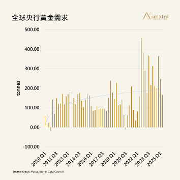 在川普貿易政策宣布後,投資人對美國與全球經濟的不確定性擔憂升溫,資金再度湧入避險資產,黃金價格一度站回每盎司3,400美元。然而,根據世界黃金協會(WGC)最新數據,儘管第二季全球黃金總需求(含場外交易)總值年增45%達1,320億美元,但央行購金卻明顯放緩,第二季僅增持166.5噸,較第一季下滑三分之一,創2022年來最低半年增持量。