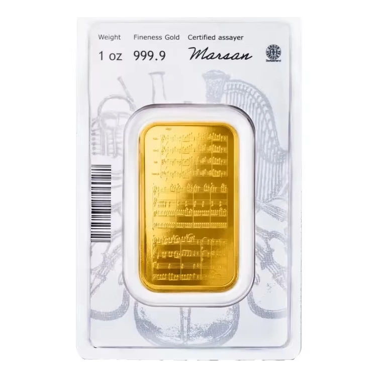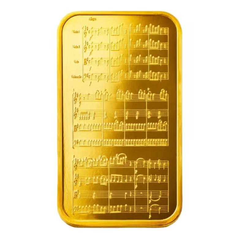 金條正面採用奧地利鑄幣廠的經典造型款式,刻有經典的奧地利鑄幣廠的鑄造標記、純度、重量以及獨特序列號,每一個細節都經過精心雕琢,讓藏家在每次的欣賞都能感受到其奢華與獨特的質感。金條的背面則刻有享有奧地利古典音樂巨匠的莫札特不朽名作《小夜曲》(Eine Kleine Nachtmusik)開頭樂譜,以精湛的工藝鐫刻於純金之上。金色的樂符在陽光下閃耀著耀眼的光芒,彷彿奏出一曲永恆的旋律,呈現出古典音樂的優雅與精緻。每條金條皆封裝於專屬檢驗卡中,不僅保證了金條的真偽,也方便藏家收藏及展示!