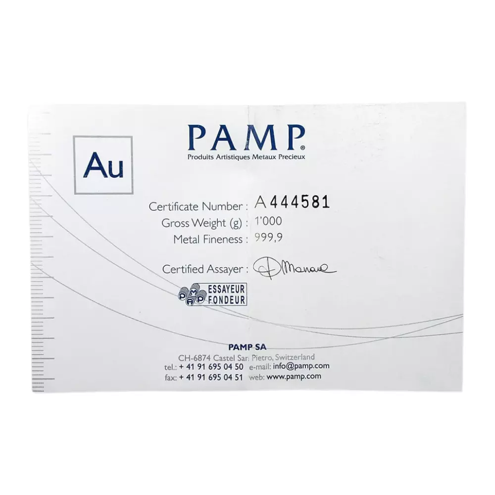 瑞士PAMP澆鑄金條1公斤是在PAMP瑞士公司專業鑄造,黃金純度為 99.99%。PAMP是世界上最大和最著名的 LBMA 貴金屬精煉廠之一,金條的正面刻有製造商的標誌、重量和純度,並且金條的正面都刻有一個獨特的6位數的序列號。金條上還印有”ESSAYEUR FONDEUR”的字樣,旁邊還有一個矩形的 PAMP 標誌。這個印記保證了用來鑄造金條的黃金是經過化驗和認證的,代表是真實的且是最好的質量,PAMP 澆鑄金條為投資者提供了大量購買黃金的機會。