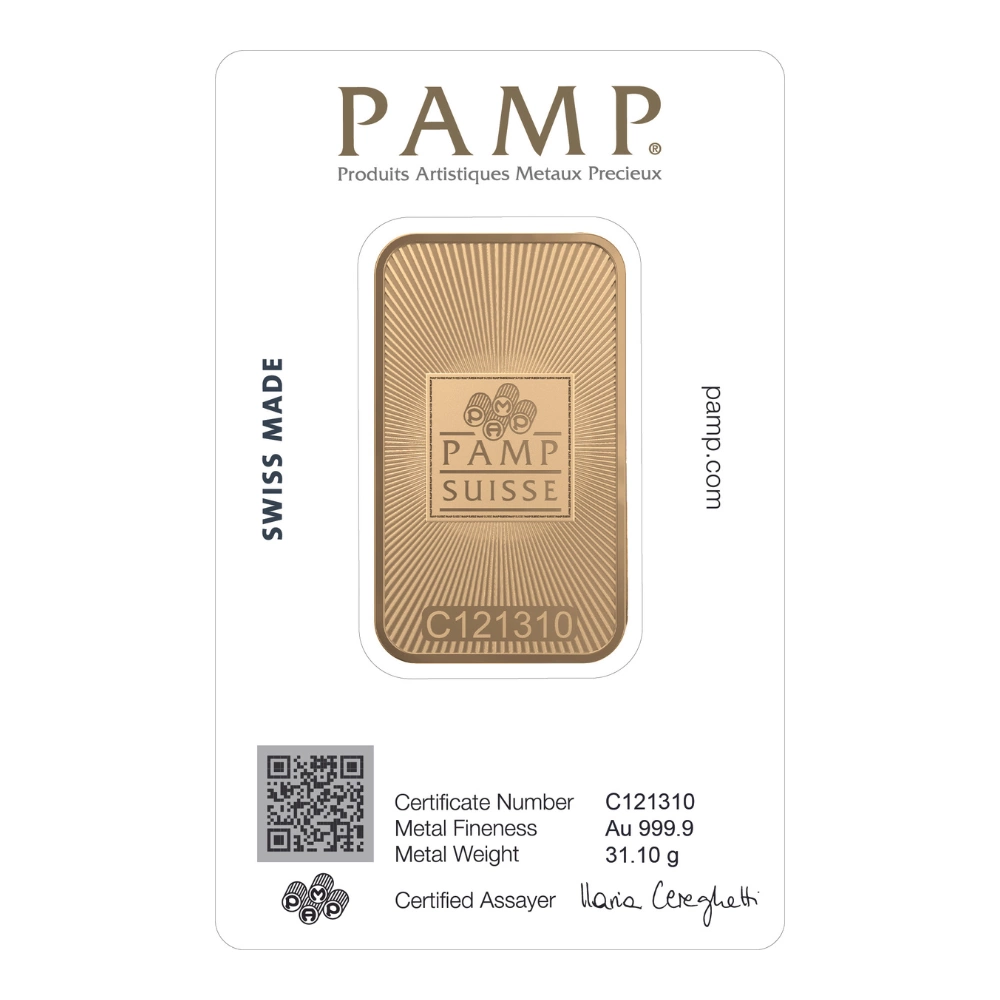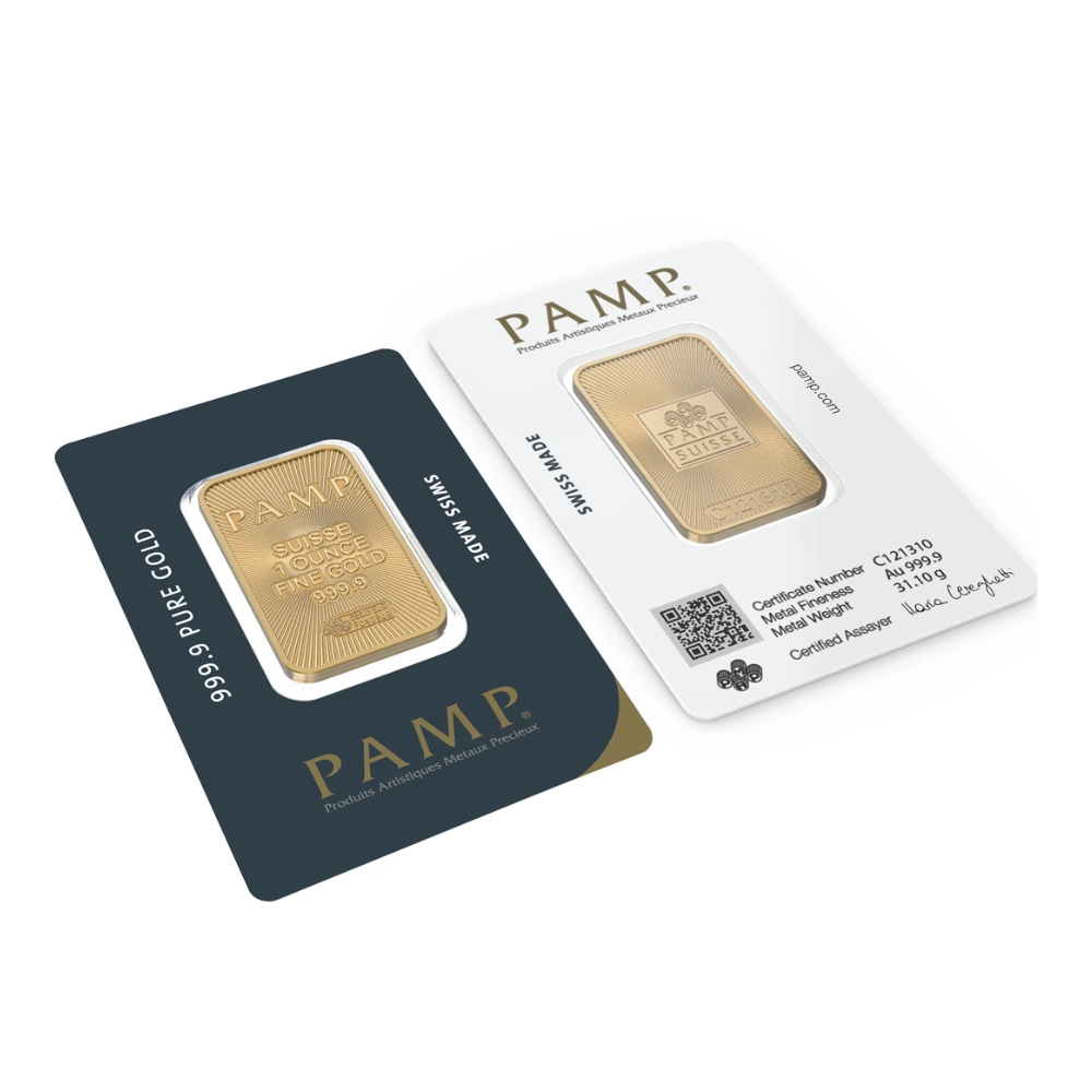 與所有PAMP品牌金條一樣,瑞士PAMP金條1盎司 – 新設計採用高質量的CertiPAMP™鑑定卡包裝。 瑞士PAMP金條1盎司 – 新設計的鑑定卡包裝以優雅的深灰色為特色,金色的PAMP品牌名稱和相應的角落裝飾圖案,標誌著易於拆卸的保護膜的位置,以保護在運送或處理過程中可能發生的刮傷或其他瑕疵。白色正面印有經認可的鑑定員官方簽名和單獨的序列號,該序列號也印在金條的背面。