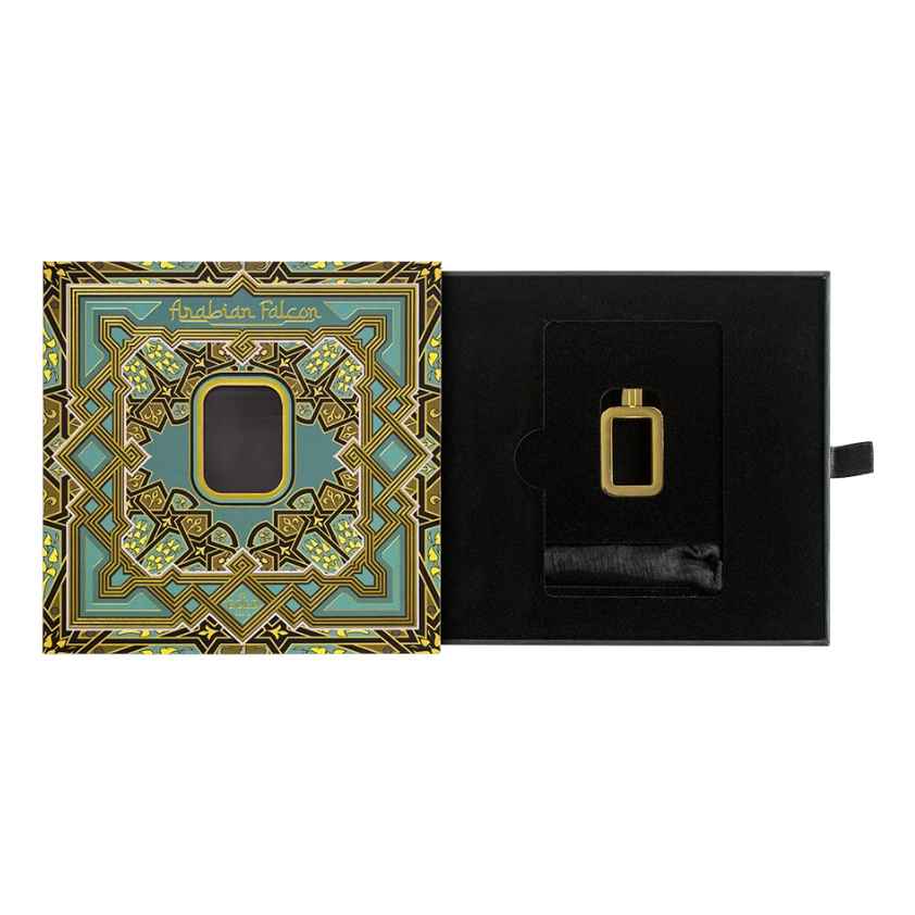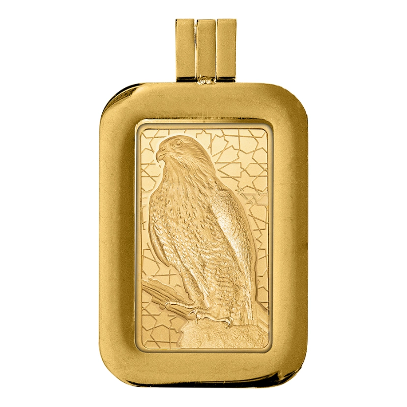 金條正面栩栩如生地鐫刻著一隻威武的阿拉伯獵鷹,牠目光銳利,彷彿正俯瞰著廣袤的沙漠,展現出獵者特有的敏捷與力量。背景則飾以精緻的幾何圖案,交織出濃郁的中東文化風情,與獵鷹的主題相得益彰。金條背面設計簡潔而精緻,鐫刻著PAMP Suisse的鑄造標記、獨特編號以及金條的規格資訊。背景以細密的幾何紋路作為底襯,增添了視覺上的層次感和防偽功能。隨附的金色合金墜飾框採用無縫卡扣設計,能穩固夾合金條作為吊墜佩戴,既能完整展露金條細節,又能作為隨身佩戴的貴金屬藝術品。