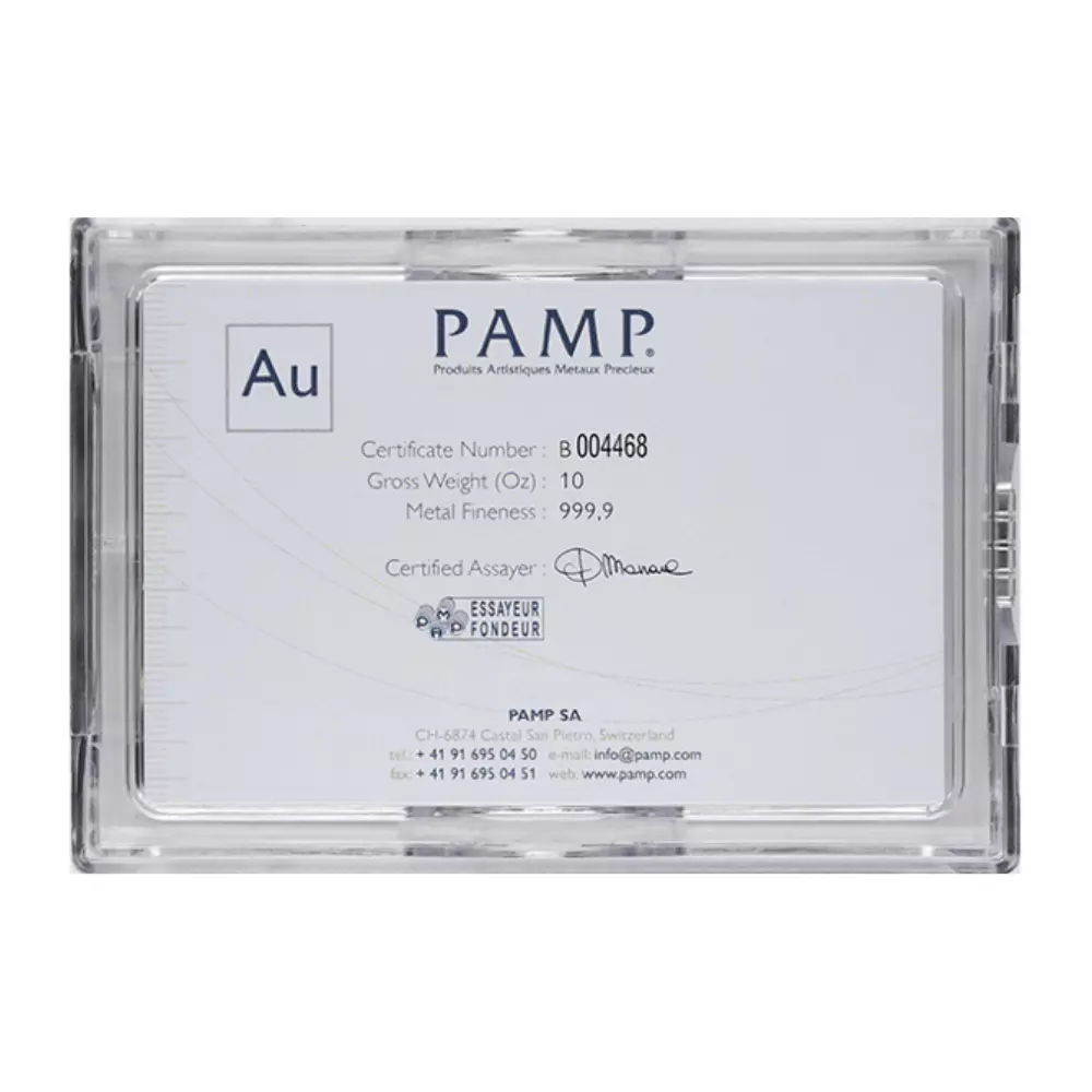 此金條出自瑞士PAMP的精湛工藝之手,受到瑞士國家銀行與倫敦金條市場協會(LBMA)的「Good Delivery」高度認證。每塊金條都印證著99.99%的純金,並隨附獨特註冊編號以及專家簽名的官方「鑄條證書」,為您確保其無與倫比的純度、準確重量和黃金含量。