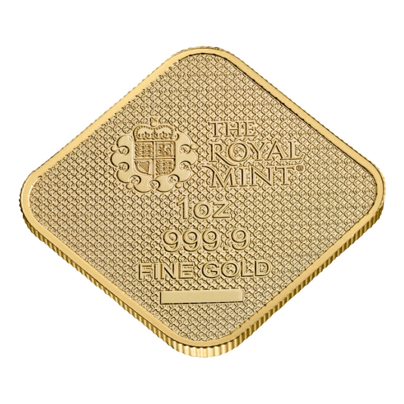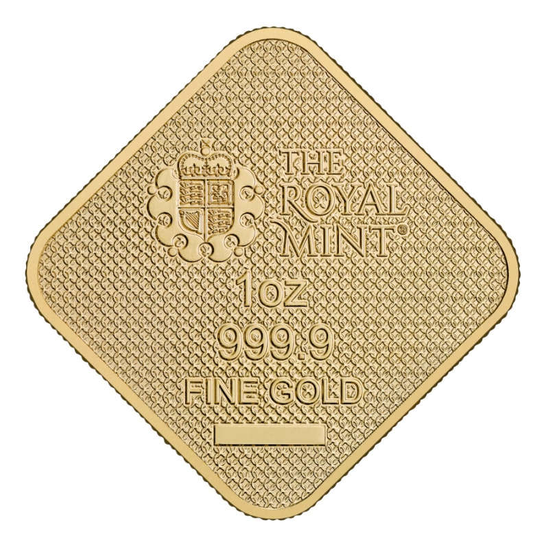 金條正面以精細的浮雕工藝,呈現了西敏寺加冕十神獸環繞英國女王伊莉莎白二世的莊嚴景象,象徵著王權的永恆與神聖。從持盾的英格蘭雄獅、展翅的威爾斯紅龍,到罕見的蒲氏羊角獸,每隻神獸的紋理與姿態都經過立體雕刻,彷彿要躍出金條,展現了英國皇家歷史的莊嚴與輝煌。金條背面中央清晰地呈現了英國皇家鑄幣廠的標記,包括盾徽、皇冠等元素,象徵著英國皇室的權威與榮耀。標記下方刻有「1oz」以及「999.9 FINE GOLD」字樣,清晰地標示了金條的相關資訊。