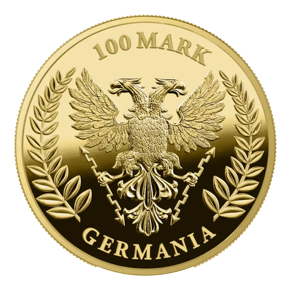 與之前的硬幣相同,2023年的日耳曼尼亞精鑄金章1盎司的正面圖案會隨著系列中的每枚硬幣而擴展。而今年的發行量則推出了另一種創新-將女英雄日耳曼尼亞的形象置換,她穿越未知的土地,最終將她的帝國劍Reichsschwert插入地面。