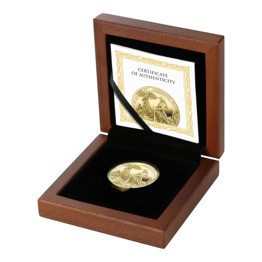 每枚硬幣都放在原廠保護殼中。隨附的原產證明書包含了硬幣的信息,並保證硬幣的原始性。此外,1盎司精鑄金章還附有一個特殊的豪華木盒,不僅可以保護,還可以增加其收藏價值。整個套裝配備了一個安全和優雅的包裝,是收藏家套裝不可或缺的一部分。