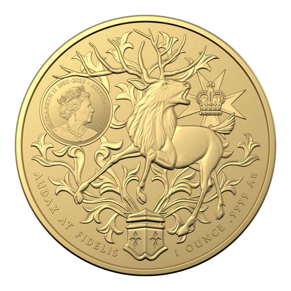 這枚金幣展現了澳大利亞紋章的經典設計。1893年,維多利亞女王正式批准了澳大利亞昆士蘭殖民地的第一個紋章。紋章的設計描繪了羊、牛、小麥和黃金,象徵著該殖民地的繁榮,並帶有拉丁語座右銘”Audax At Fidelis”——勇敢而忠誠。多年來,這種傳統設計不斷的變化,目前的紋章設計可以追溯到1977年女王伊麗莎白二世的銀禧紀念日,當時增加了紅鹿和紅冠鶴。雄鹿是澳大利亞非本土動物,象徵著與舊世界的聯繫——維多利亞女王贈送了一群來自皇家狩獵場的鹿。優美的紅冠鶴是昆士蘭州的官方鳥類,這裡象徵著當地的居民。