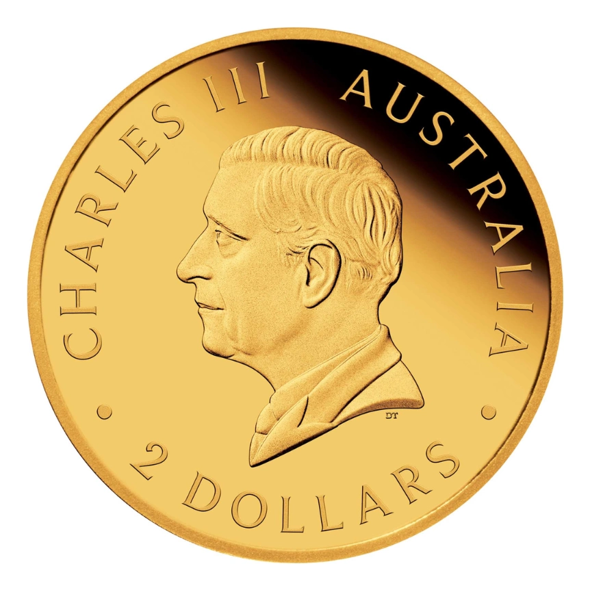 金幣正面,一隻栩栩如生的成年袋鼠呈現眼前,牠悠閒地臥在澳洲廣袤的土地上,彷彿正靜靜地感受著澳洲陽光的溫暖。背景是略微起伏的澳洲內陸景觀,簡潔而富有質感,更突顯出袋鼠的主體形象。金幣背面描繪了英王查爾斯三世的莊嚴形象,展現皇家風範的同時,更是對英國皇室的致敬。金幣周圍刻有「Kangaroo」、「2025」、「P」、「CHARLES III AUSTRALIA」、「 0.5g 9999 GOLD」以及「2 Dollars」字樣,表明金幣的相關資訊。